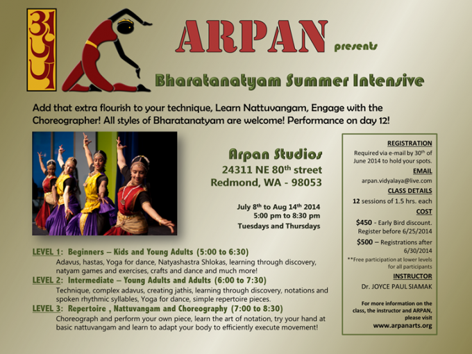 Choreograph and perform your own piece, learn the art of notation, try your hand at basic nattuvangam and learn to adapt your body to efficiently execute movement!